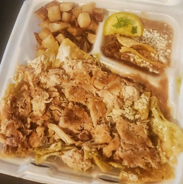 Acompañado de papa campesina y frijol. Chilaquiles sencillos: papa, frijol chilaquiles rojo o verde.