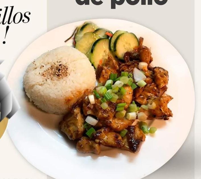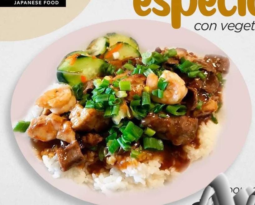Teriyaki de pollo, res, calamar y camarón a la plancha con salsa especial servido en una cama de arroz blanco, cebollín picado acompañado de ensalada areky
