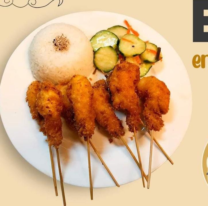 8 Camarones fritos ensartados en barillas de bambú con queso Philadelphia servidos con arroz blanco al vapor, salsa especial y ensalada areky