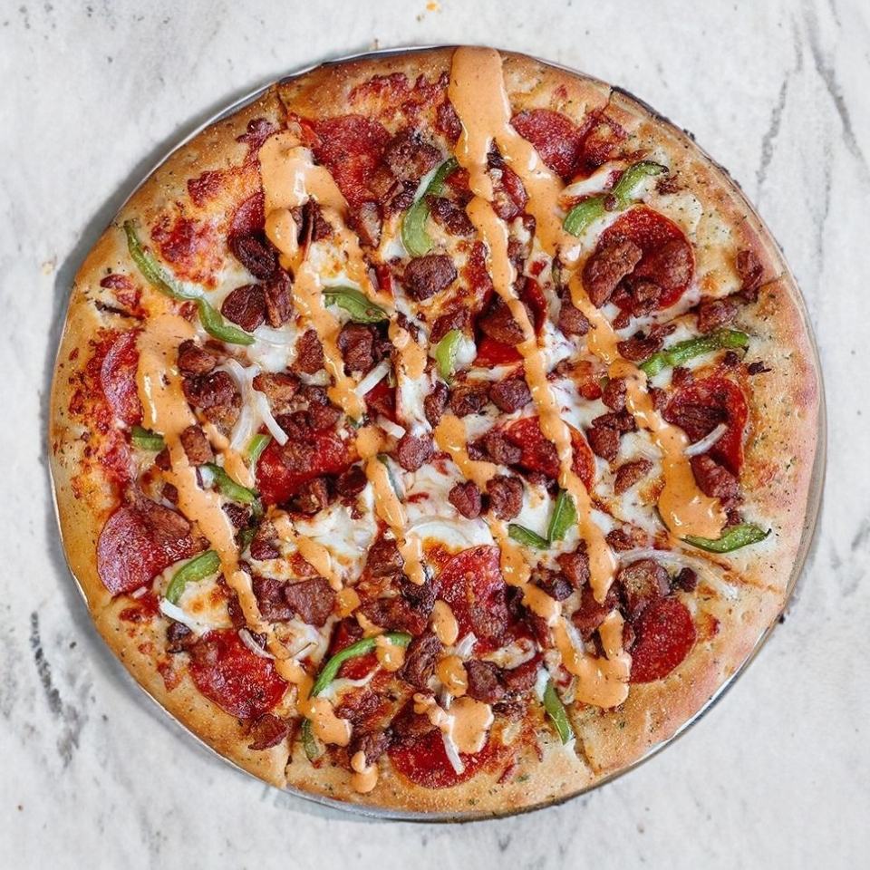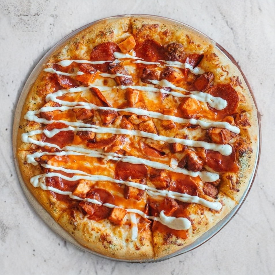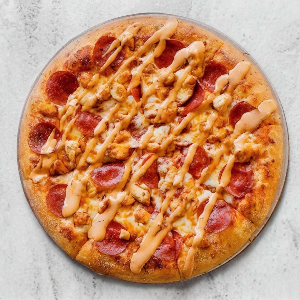 Pechuga de pollo, pepperoni y aderezo chipotle sobre salsa Artezza y mozzarella derretida. ¡Un toque picante y cremoso que eleva cada bocado! (12 Pulgadas)
