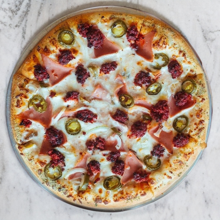 Frijoles, chorizo, jalapeños y jamón en una explosión de sabores mexicanos, cubiertos de queso mozzarella derretido sobre salsa Artezza. ¡Perfecta para los amantes del picante! (12 Pulgadas)