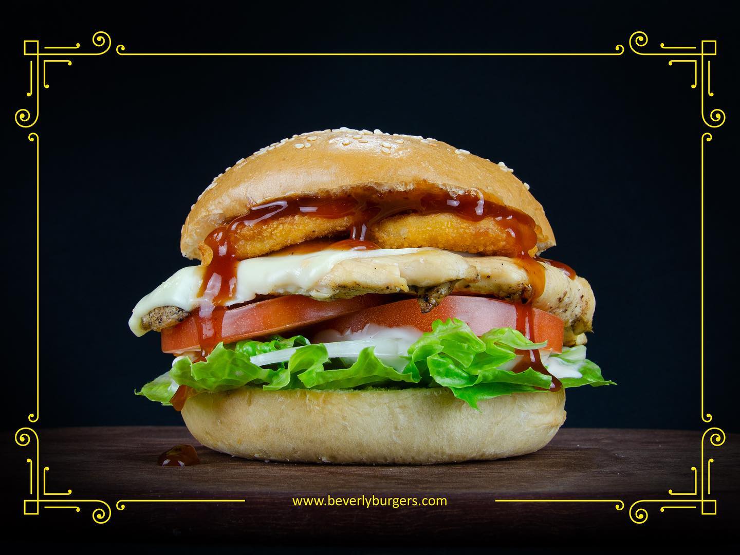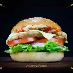 Doble filete de pechuga de Pollo asada al carbón, salsa BBQ, aros de cebolla, lechuga, tomate, cebolla, queso suizo, aderezo Ranch y mayonesa.