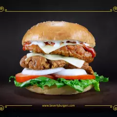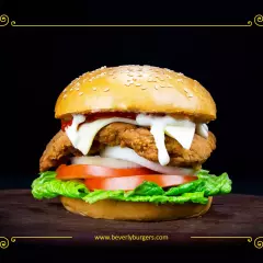 Doble pechuga de Pollo spicy crujiente, salsa BBQ, aros de cebolla, lechuga, tomate, cebolla, queso suizo, aderezo Ranch y mayonesa.