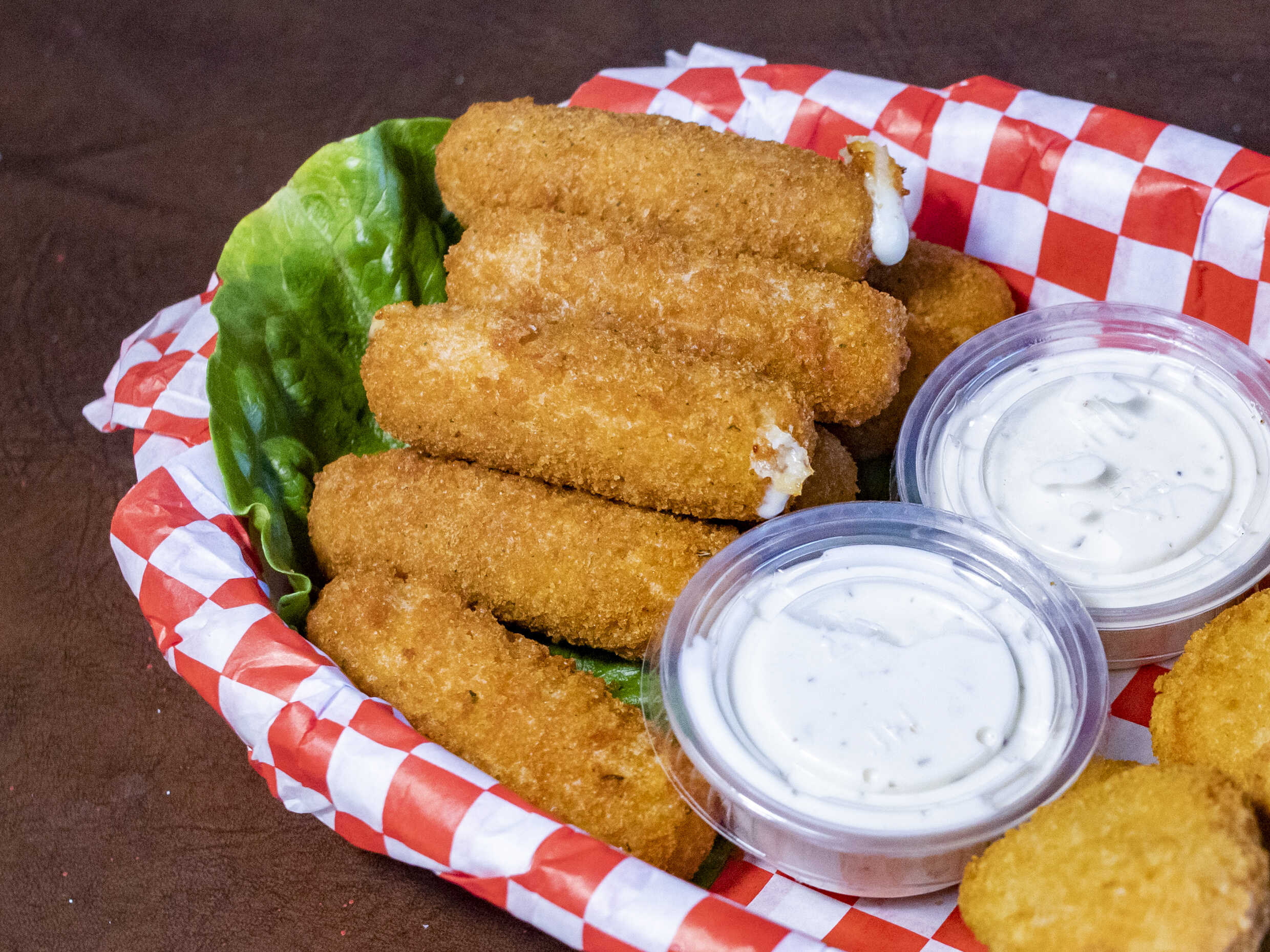 Rodajas de cebolla empanizadas y crijuentes con su tradicional aderezo ranch.