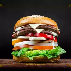Doble carne, salsa bbq, aros de cebolla, lechuga, tomate, cebolla, queso suizo, aderezo ranch y mayonesa