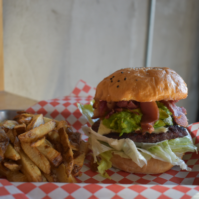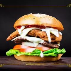 Carne, pollo spicy, salsa bbq, aros de cebolla, lechuga, tomate, cebolla, queso suizo, aderezo ranch y mayonesa