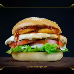 Pechuga doble de pollo, salsa bbq, aros de cebolla, lechuga, tomate, cebolla, queso suizo, aderezo ranch y mayonesa