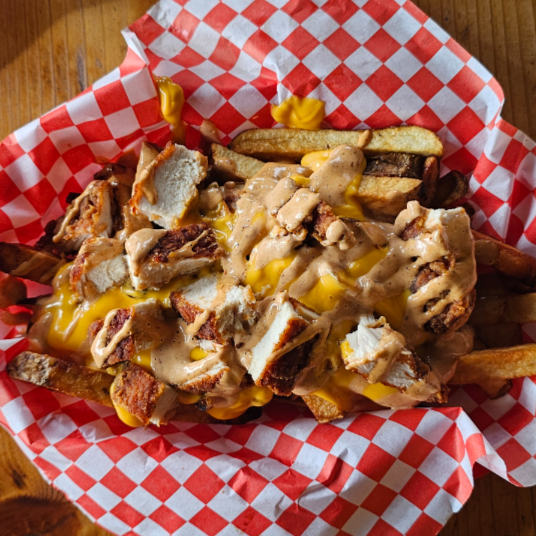 Papas con spicy de pollo y aderezos