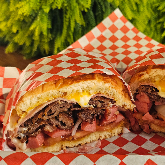 Carne, pollo spicy, lechuga, tomate, cebolla, queso americano y suizo, aderezo ranch, catsup y mayonesa