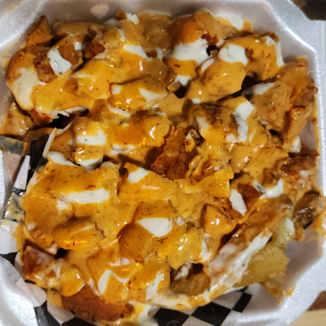 Papas a la Francesa sazonadas con Pechuga de Pollo empanizada picante, con aderezo chipotle y ranch