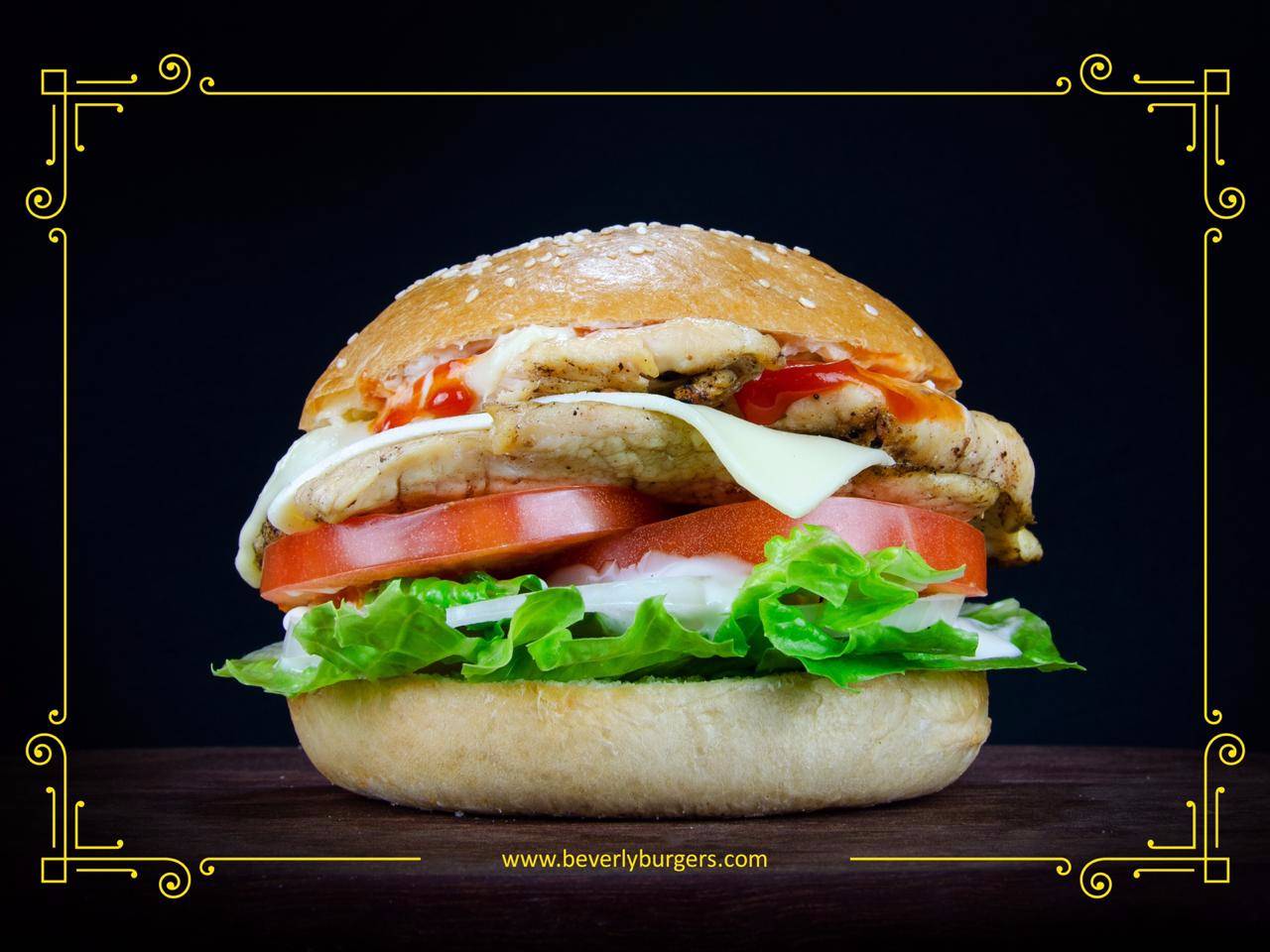 Carne, pollo spicy, lechuga, tomate, cebolla, queso americano y suizo, aderezo ranch, catsup y mayonesa