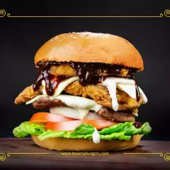 Carne, pollo spicy, salsa bbq, aros de cebolla, lechuga, tomate, cebolla, queso suizo, aderezo ranch y mayonesa