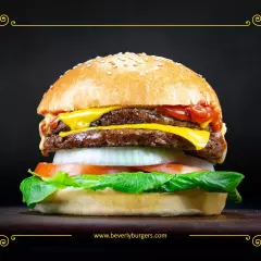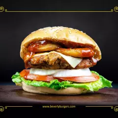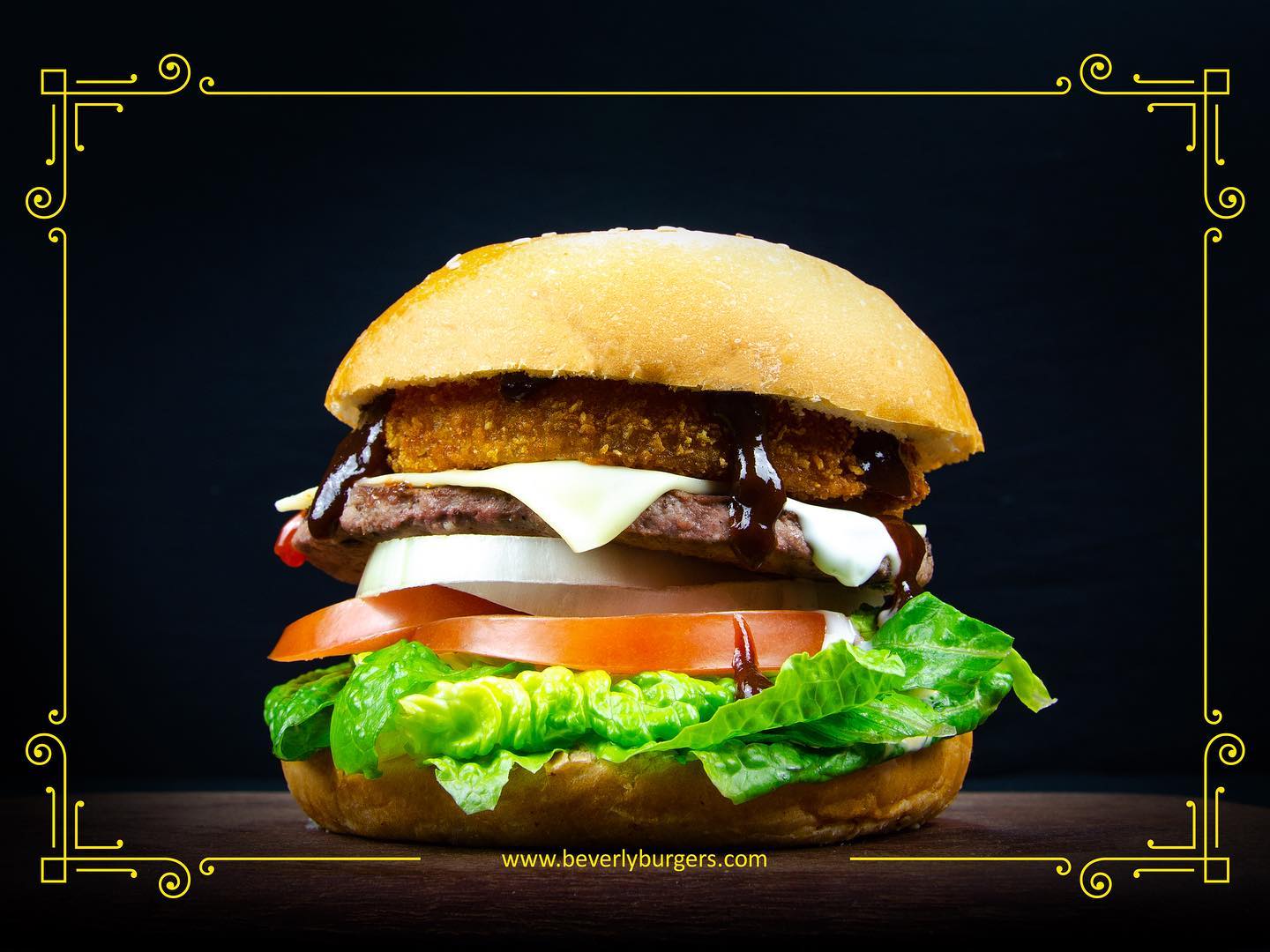Doble carne, salsa bbq, aros de cebolla, lechuga, tomate, cebolla, queso suizo, aderezo ranch y mayonesa