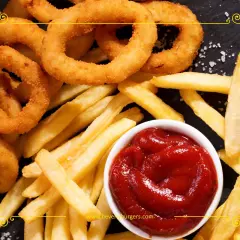 Carne, salsa bbq, aros de cebolla, lechuga, tomate, cebolla, queso suizo, aderezo ranch y mayonesa