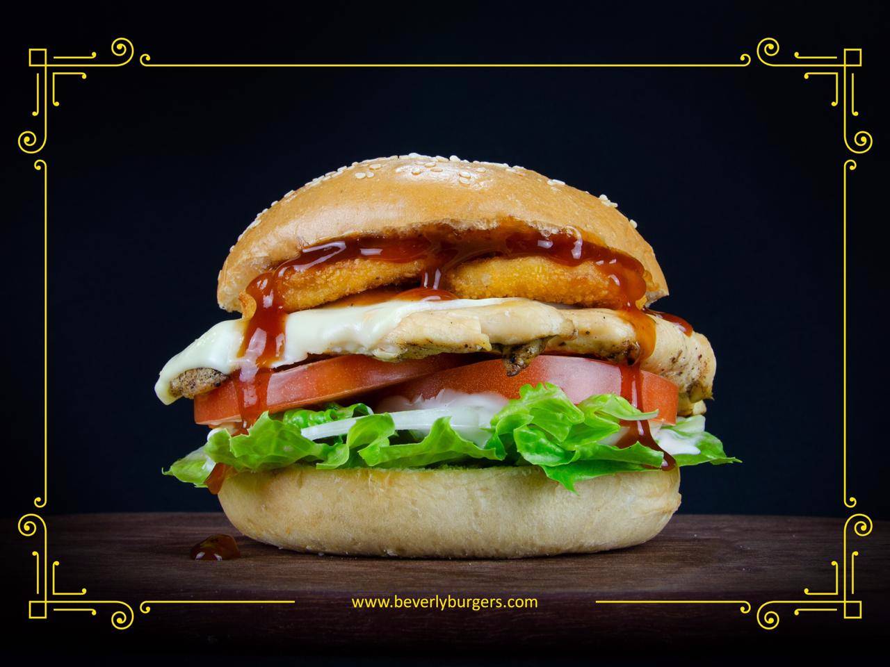 Pechuga doble de pollo, salsa bbq, aros de cebolla, lechuga, tomate, cebolla, queso suizo, aderezo ranch y mayonesa