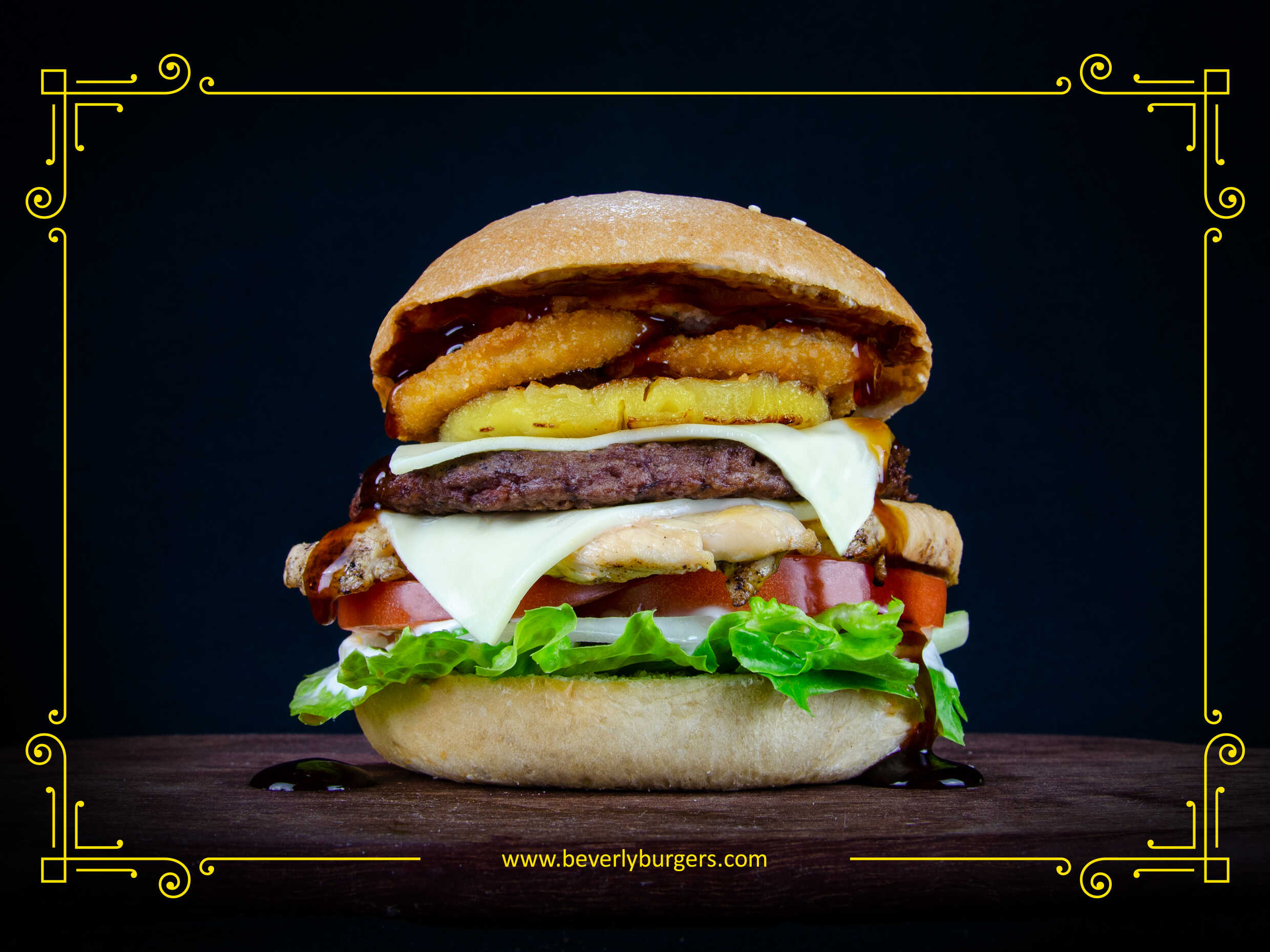 Doble carne asada al carbón, piña, jamón lechuga, tomate, cebolla, queso suizo, catsup, aderezo Ranch y mayonesa.
