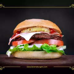 Doble carne asada al carbón, lechuga, tomate, queso americano, cebolla catsup, aderezo mil islas y mayonesa.