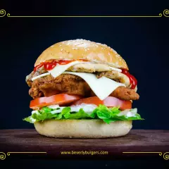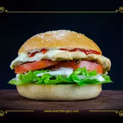 Doble filete de pechuga de pollo asada al carbón, salsa BBQ, aros de cebolla, lechuga, tomate, cebolla, queso suizo, aderezo Ranch y mayonesa.