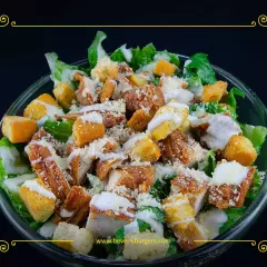 Filete de pollo asado al carbón, lechuga romana, parmesano, crutones y aderezo cesar.