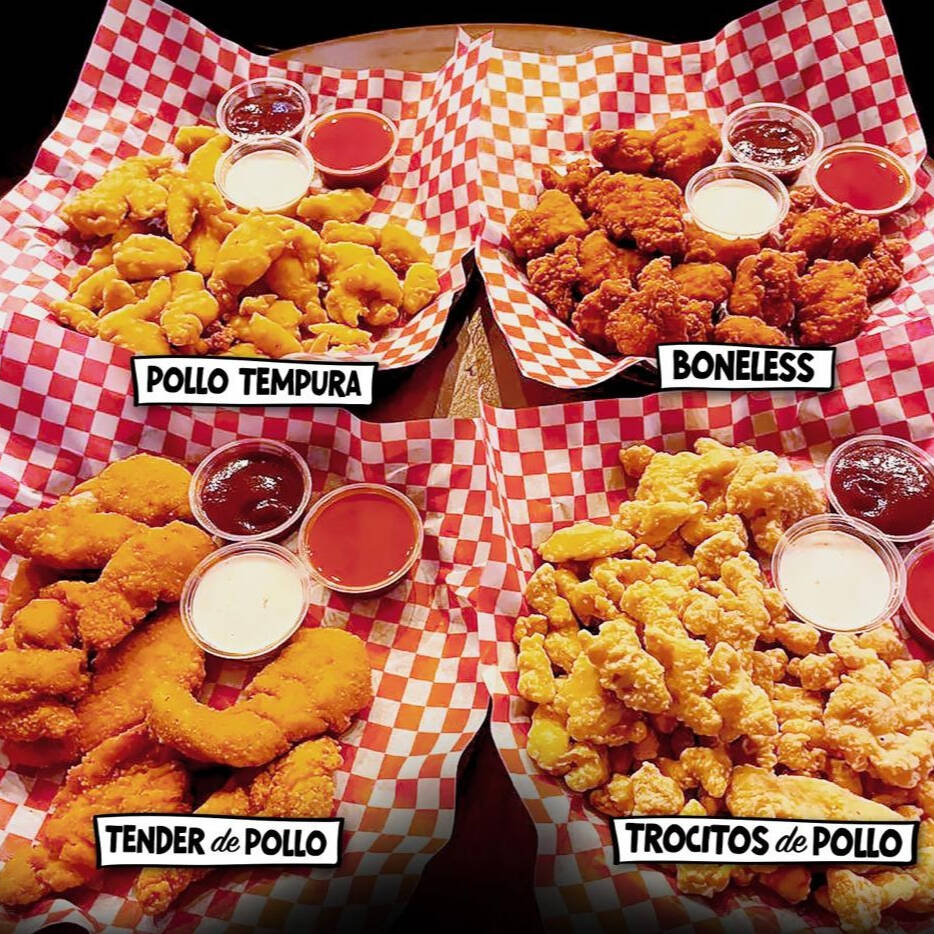 Boneless de pollo bañados en la salsa de tu eleccion, incluye papas de la casa.