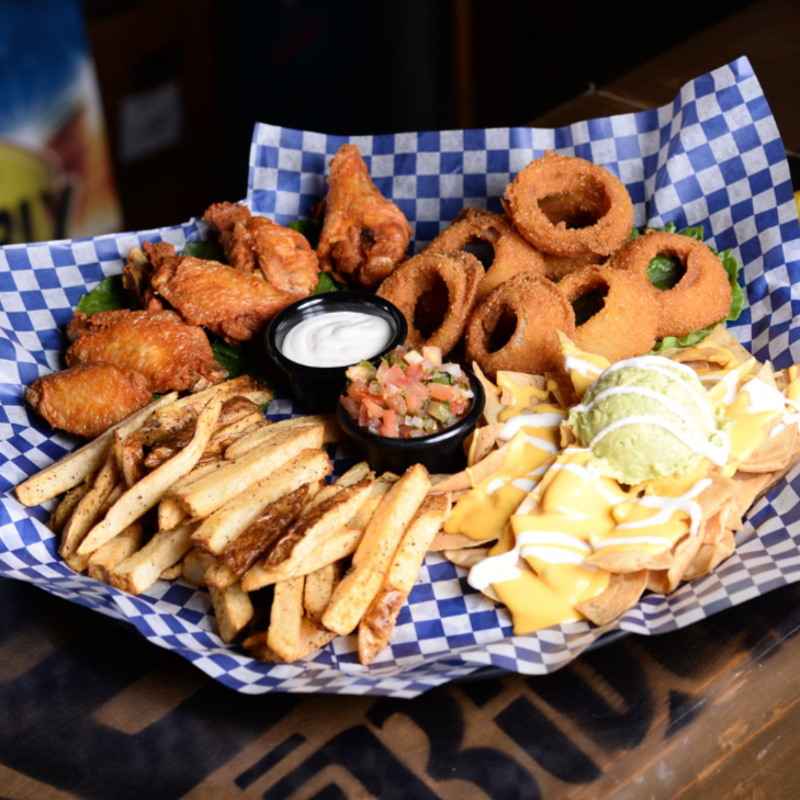 Una botana completa que mezcla 4 productos de nuestro menú, papas a la francesa 100% natural, aros de cebolla crujiente, nachos preparados y alitas tradicionales bbq o buffalo y aderezo ranch. (calculado aproxi 3 personas)