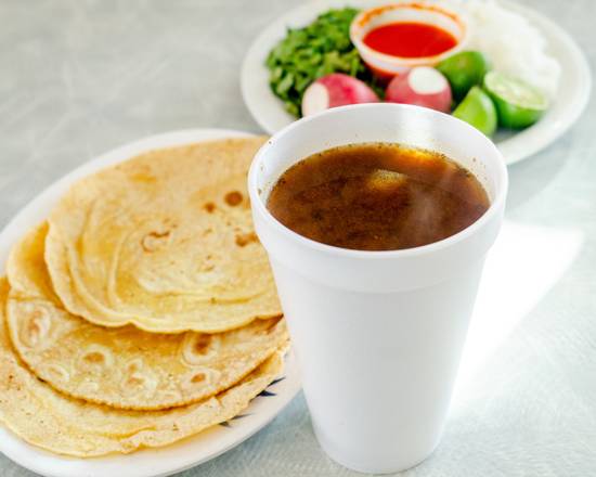 Incluye vaso de 12 oz. Con cilantro cebolla y tortillas