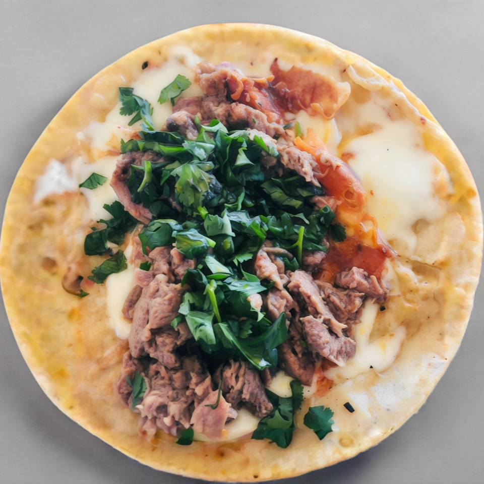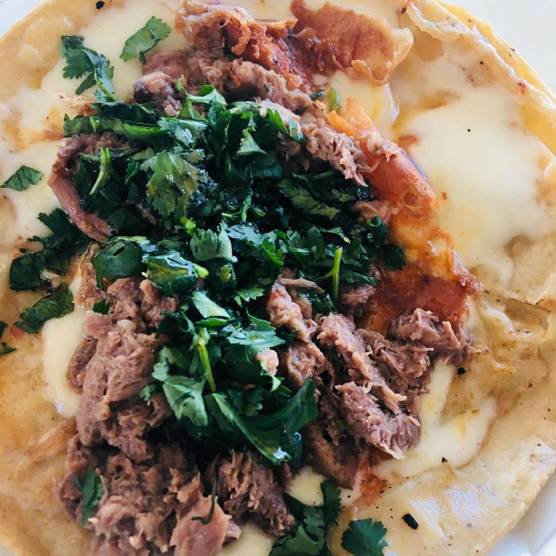 Una deliciosa costra de monterrey jack acompañada con una tortilla doradita y carne de tu preferencia.