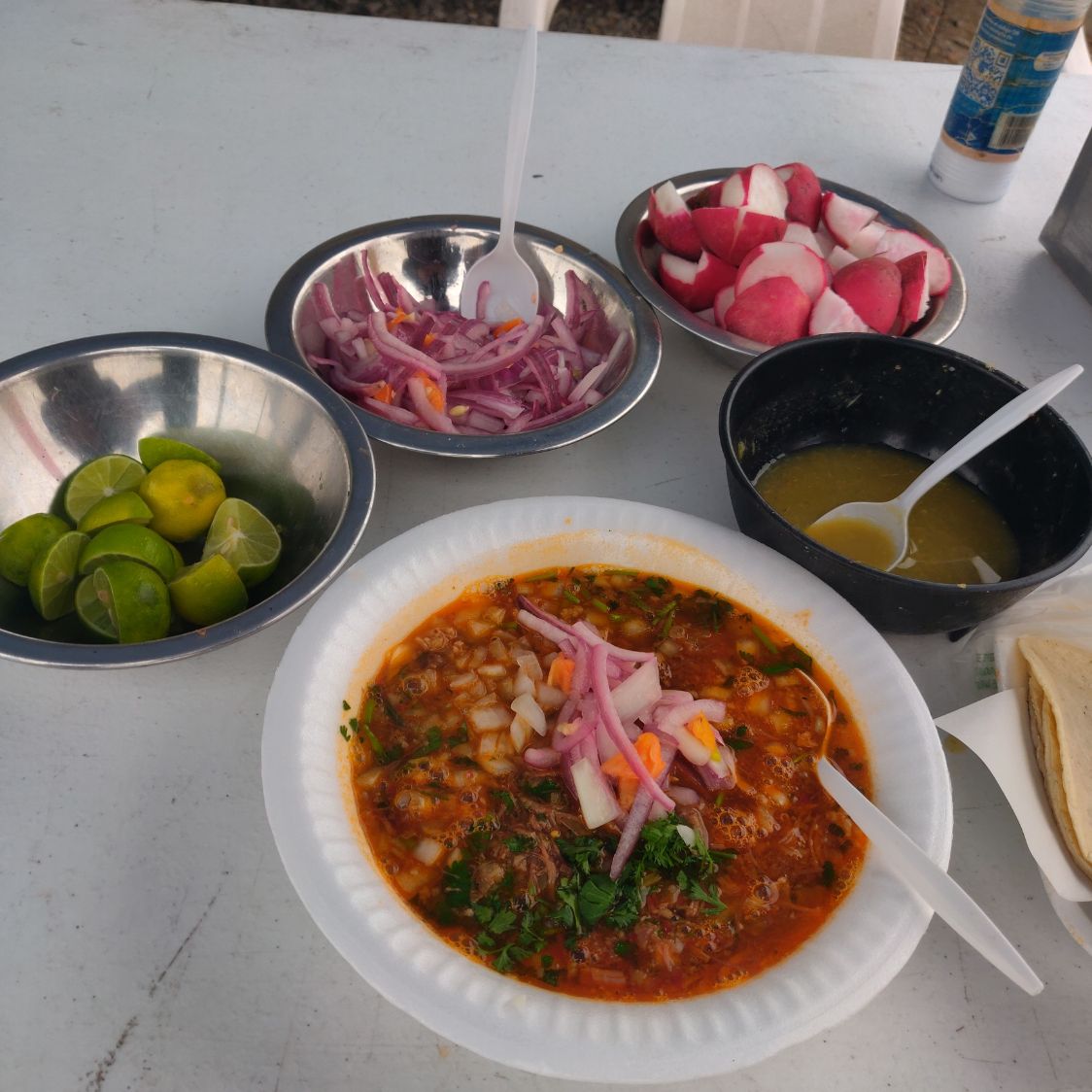 1 Litro de rica birria de cabeza de res o maciza, acompañada de limones, rábanos, cilantro, cebolla, salsas roja y verde.