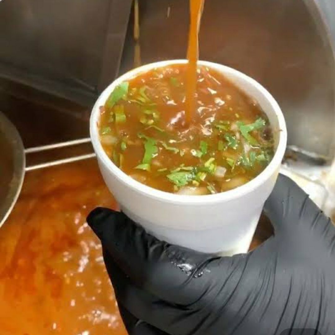 1/2 Litro de birria de cabeza o maciza acompañada de rábanos, limones, verdura y salsas roja y verde.
