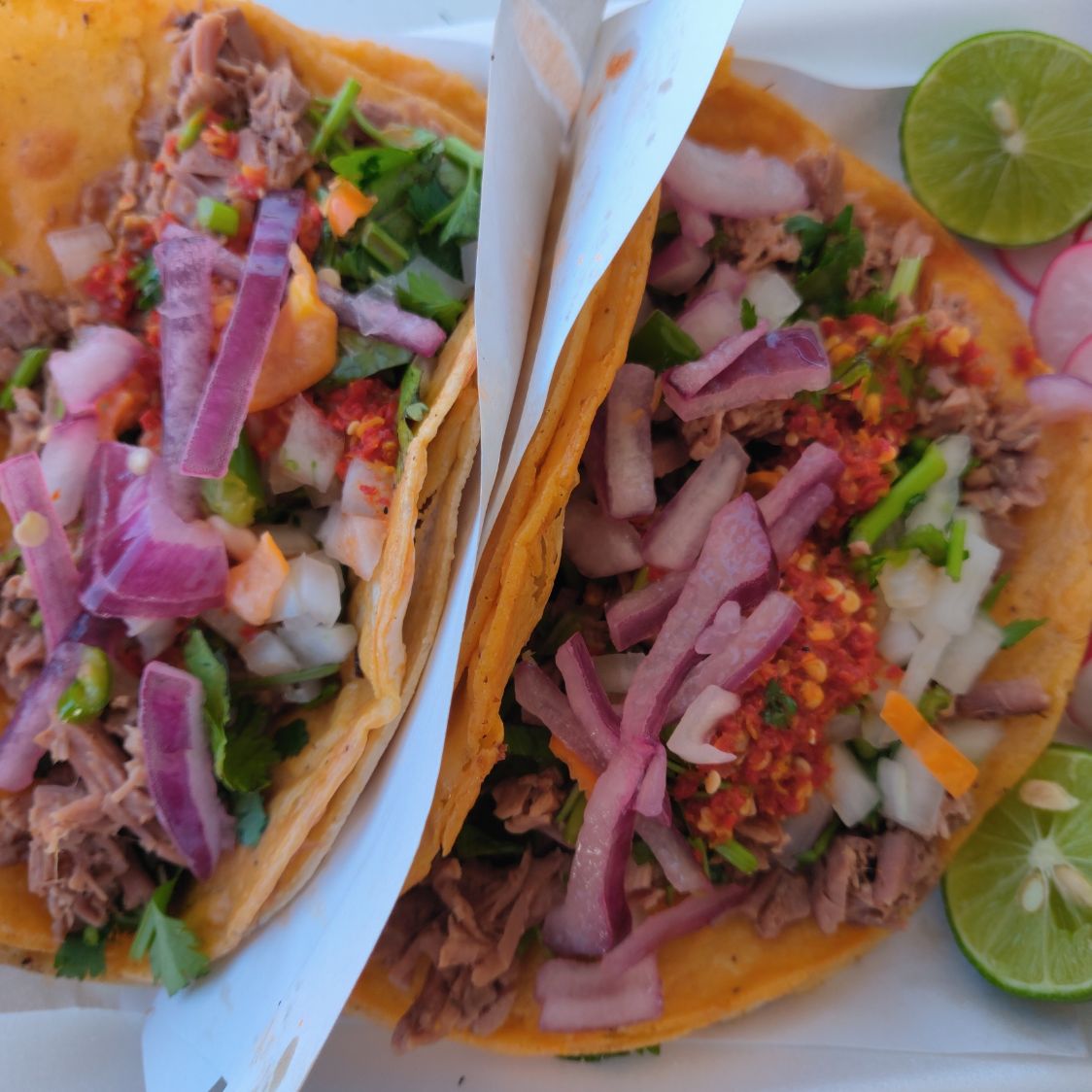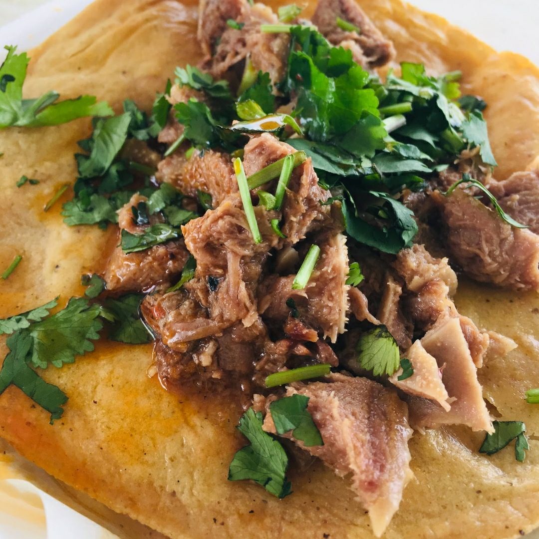 Una deliciosa combinación de carne con tortilla de maíz y verdura.