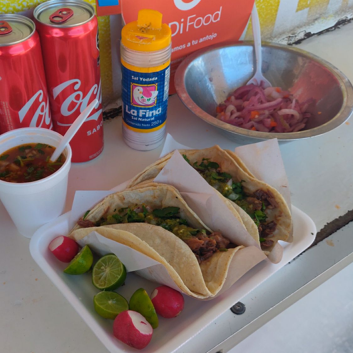 2 tacos, consomé, soda... Un combo para el antojo.