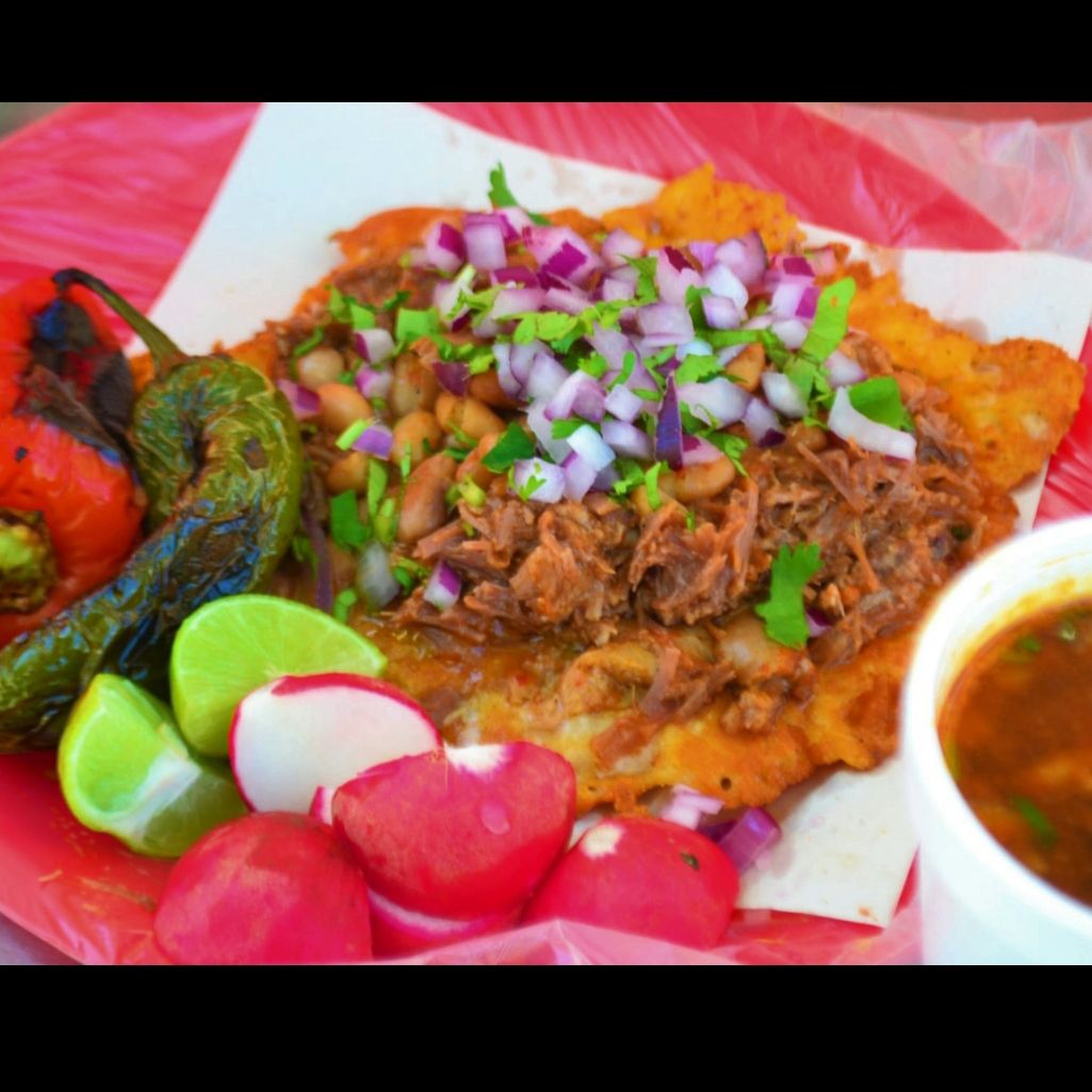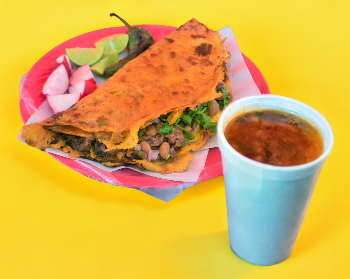 Quesabirria de Harina con frijoles, cebolla, cilantro y salsa roja.
