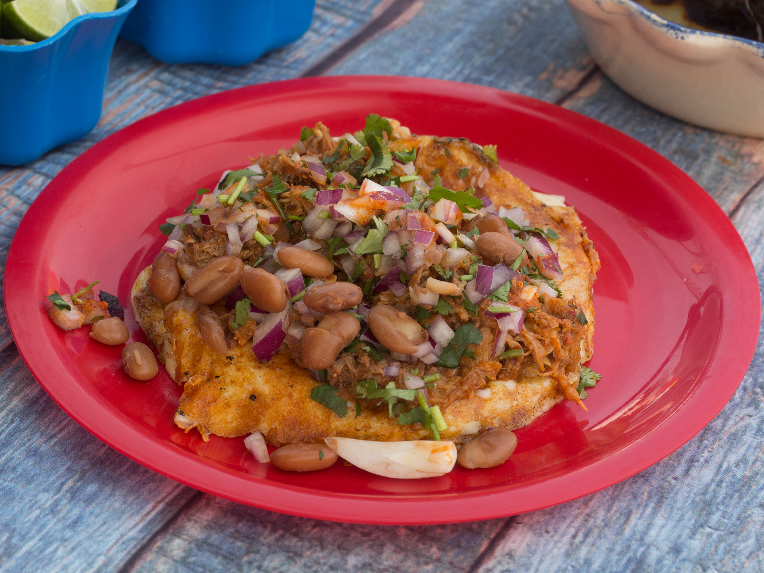 Carne, cebolla, cilantro, frijol, salsa
