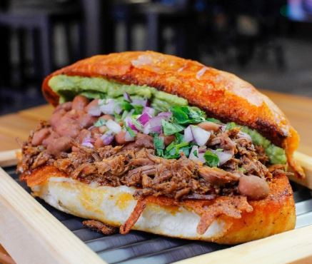taco de birria con queso, con cebolla , cilantro y bañado en salsa