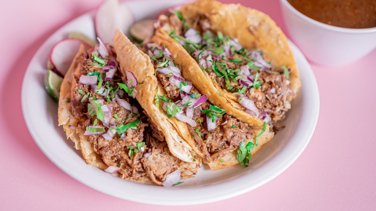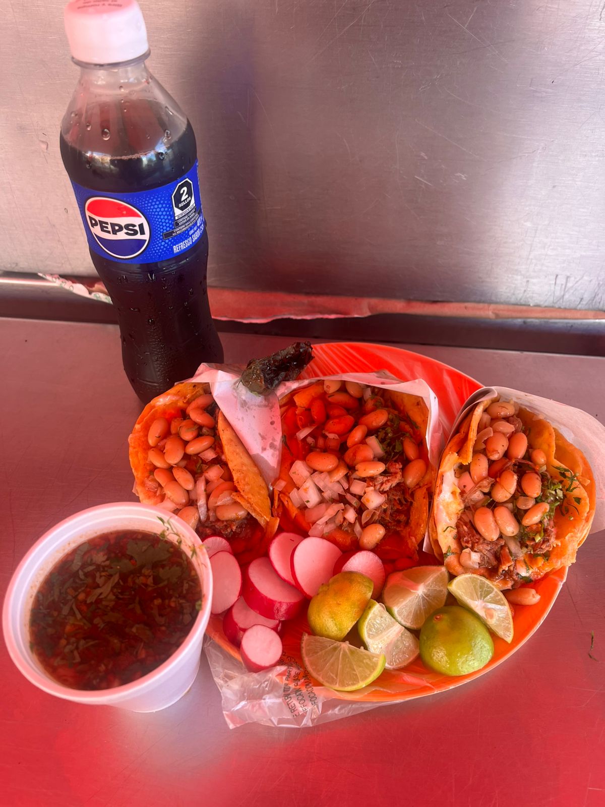 Porcion personal: 3 tacos de birria y una bebida (pepsi y manzana).