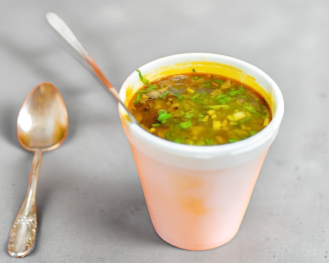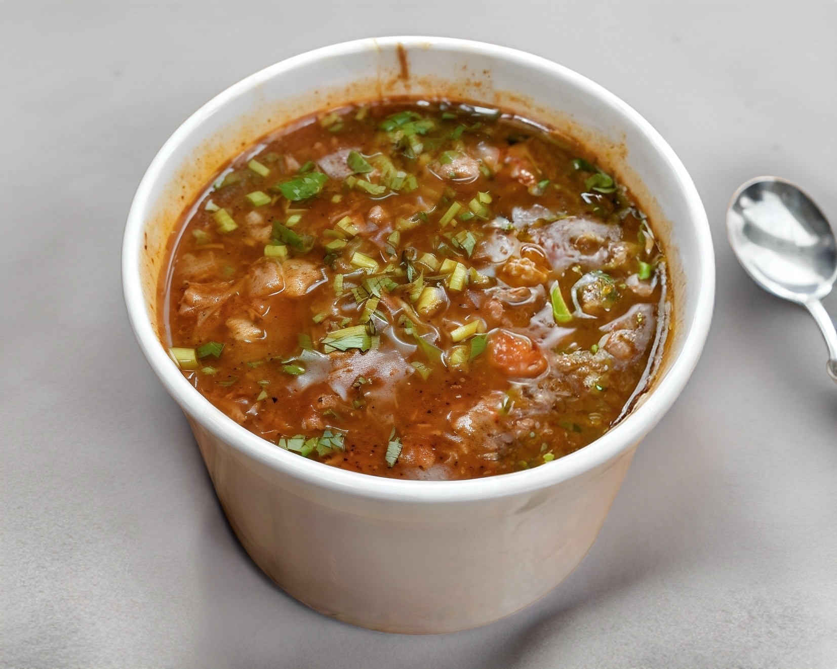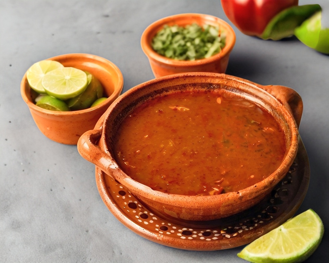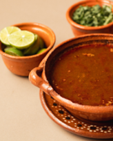 Consomé mediano de birria sin carne, con cebolla y cilantro.
