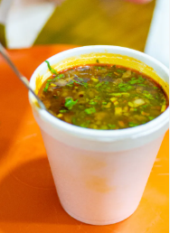 Vaso con birria de res, con cebolla, cilantro y salsa.