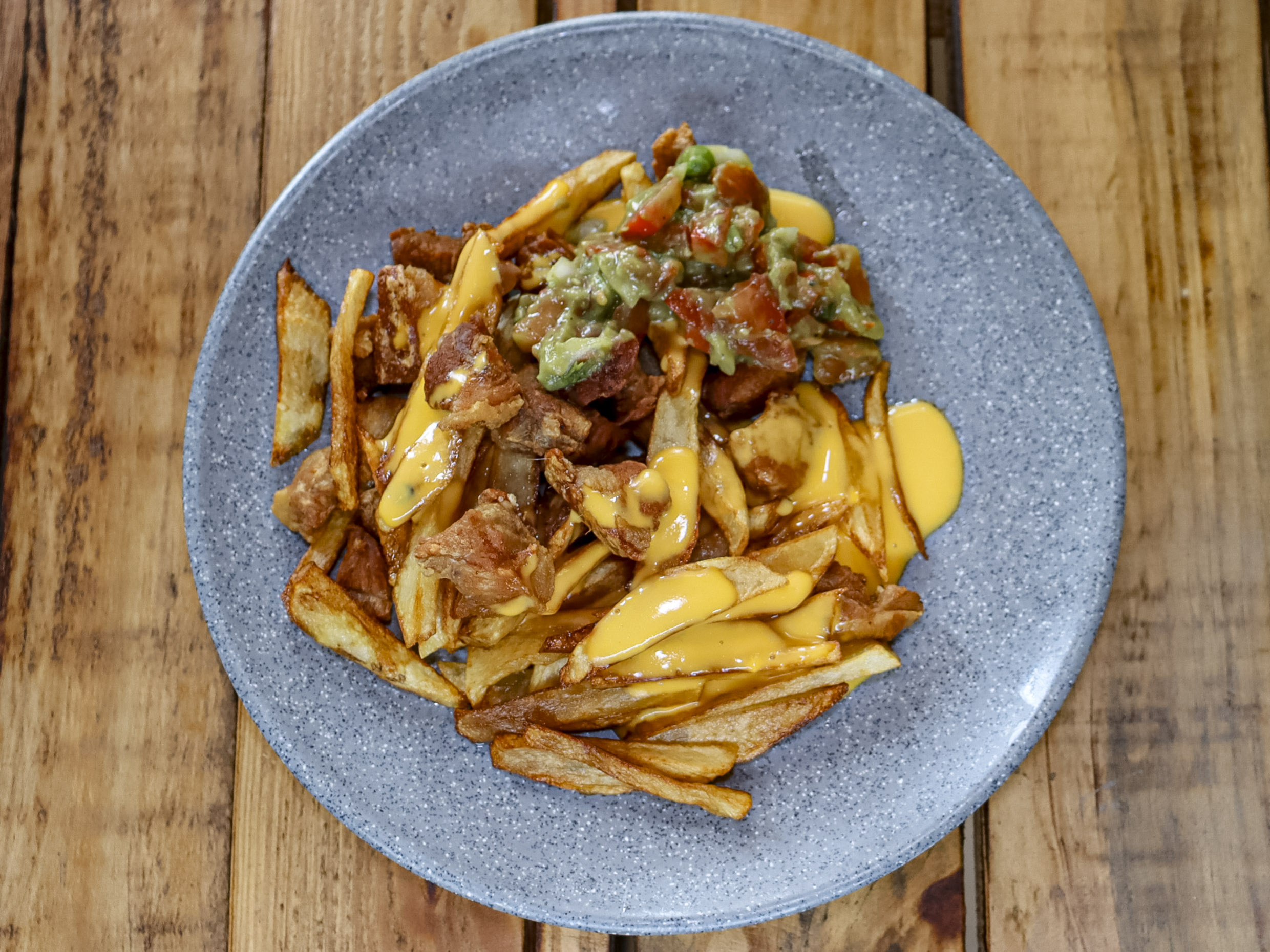 Carne de la casa con nachos con queso cheddar derretido y pico de gallo.
