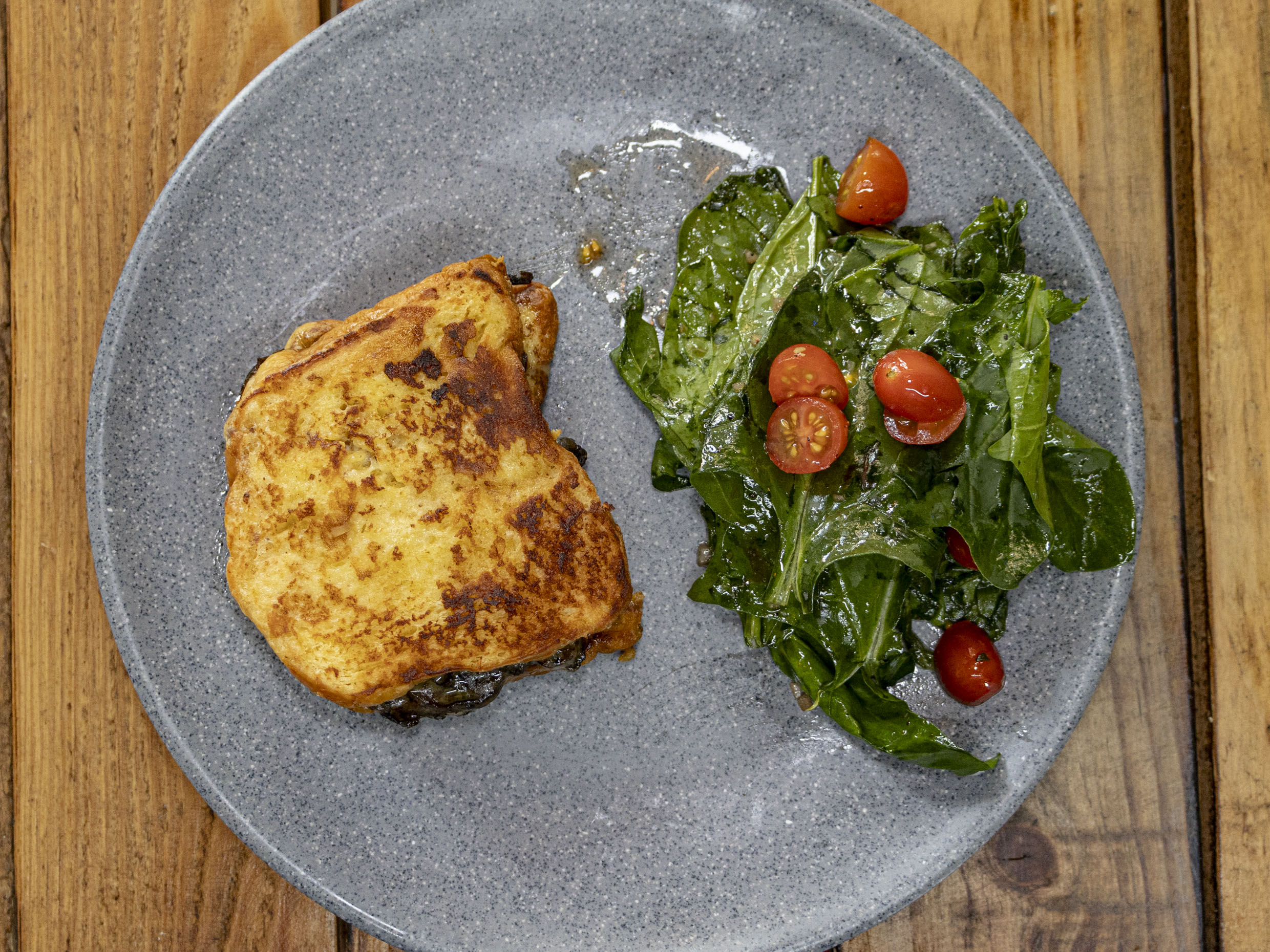Sándwich de queso a la parrilla con champiñones al ajo con pan de brioche francés.