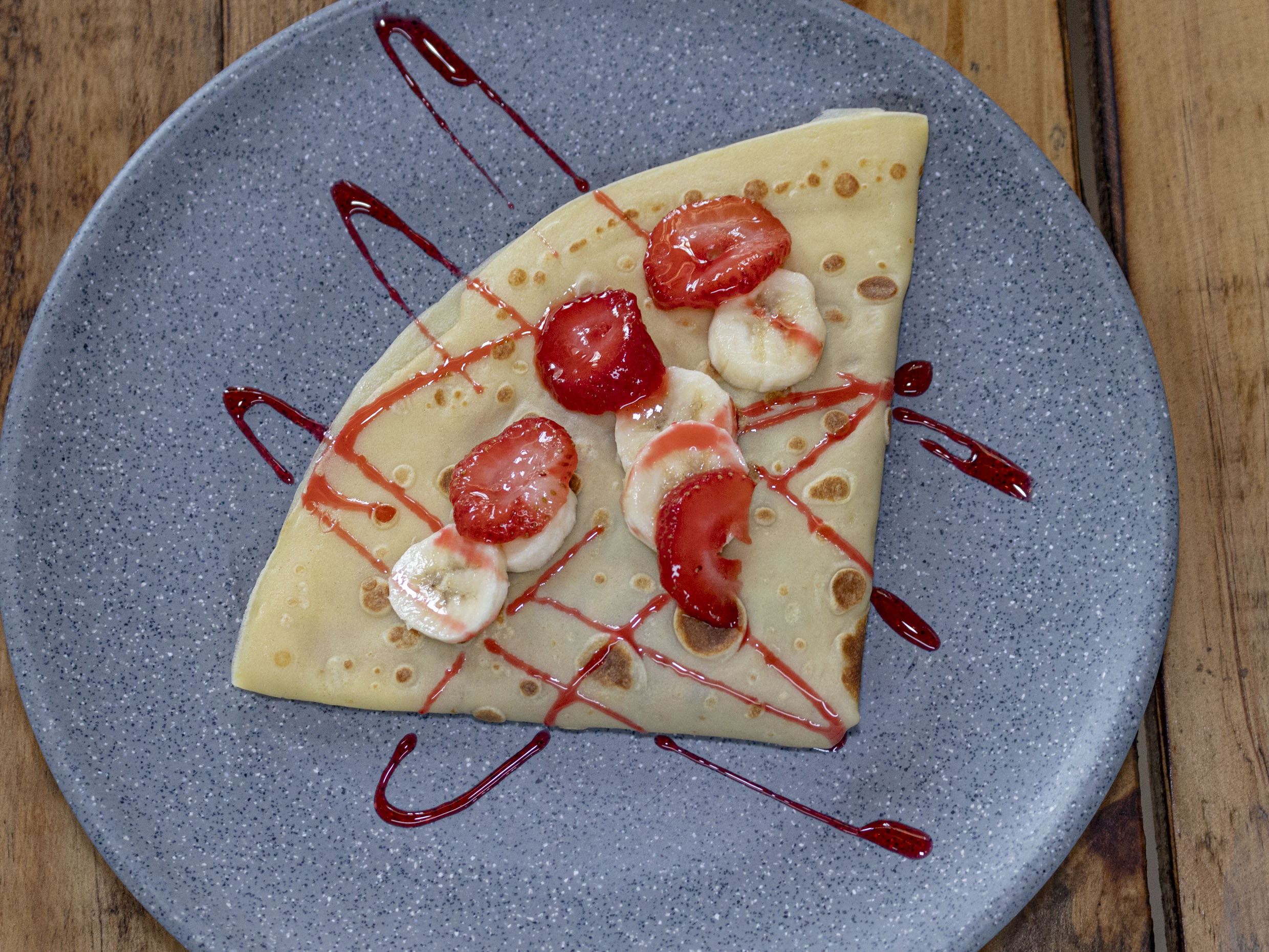 Crepa de crema de cacahuate con mermelada de fresa acompañada de plátano y fresa.