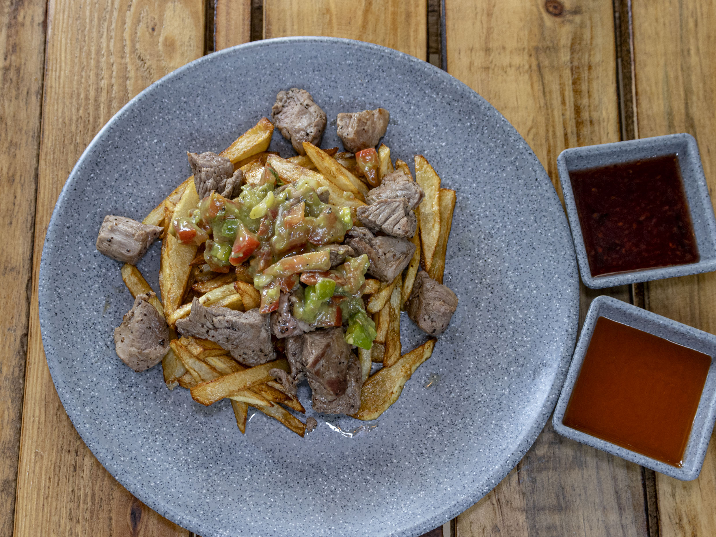Carne de la casa con papas francesas acompañadas de aderezo especial Bistro 75.