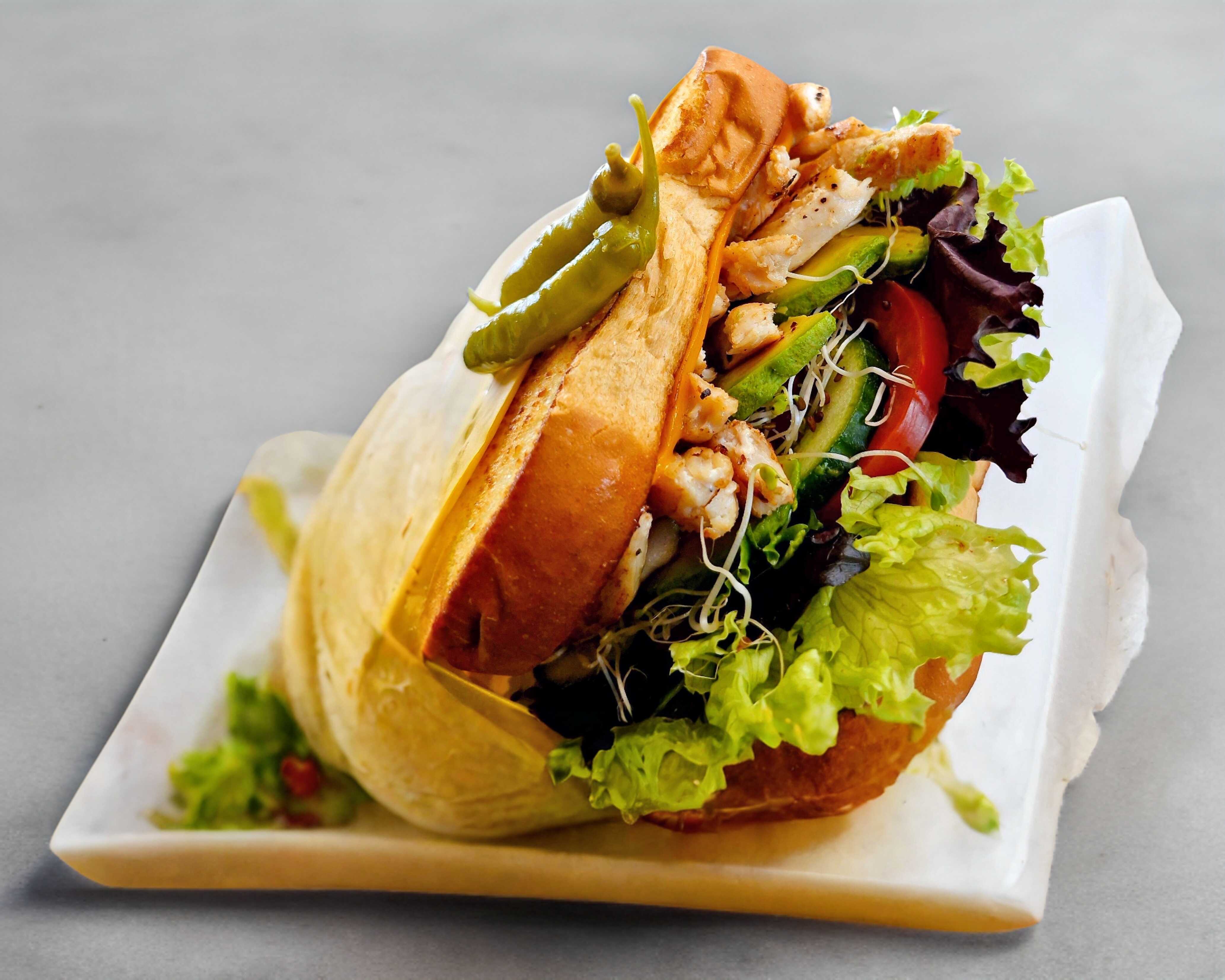 Pechuga de pollo sazonada a la plancha montada sobre una cama de lechugas mixtas, tomate, pepino, aguacate, cebolla y germinado con queso tipo americano