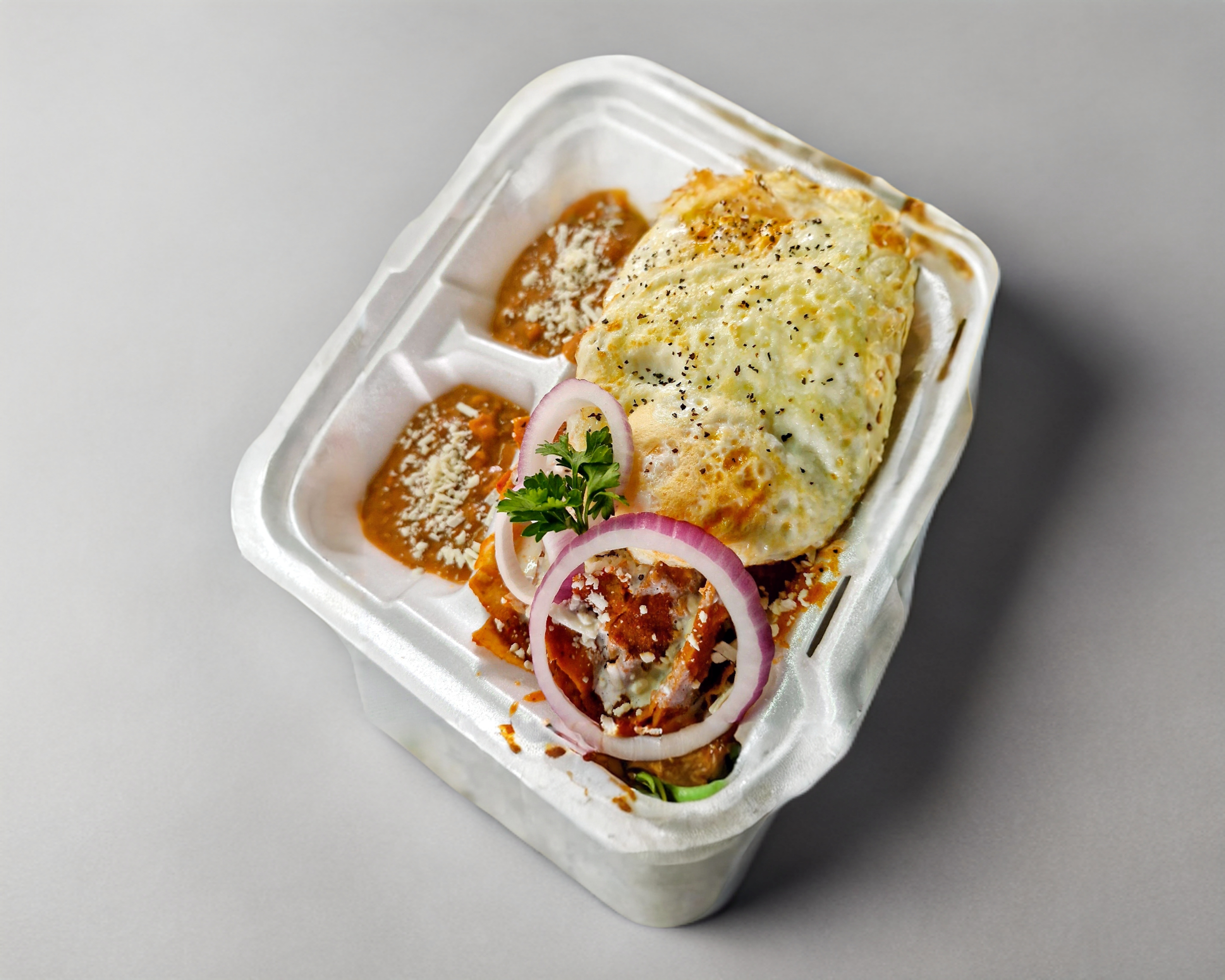 Omelette relleno de trozos de tocino dorado, acompañado de deliciosos frijoles y chilaquiles