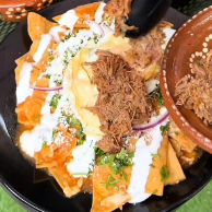 Chilaquiles, crema, queso, Cilantro, Cebolla, y birria