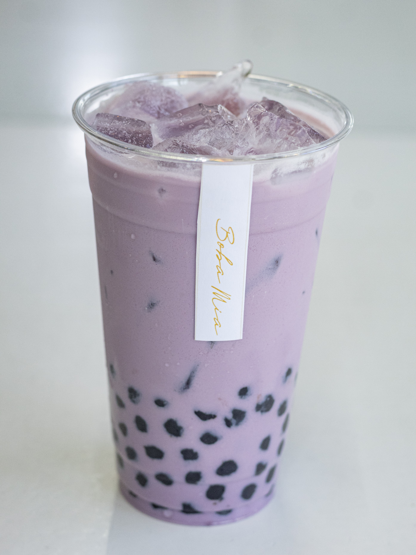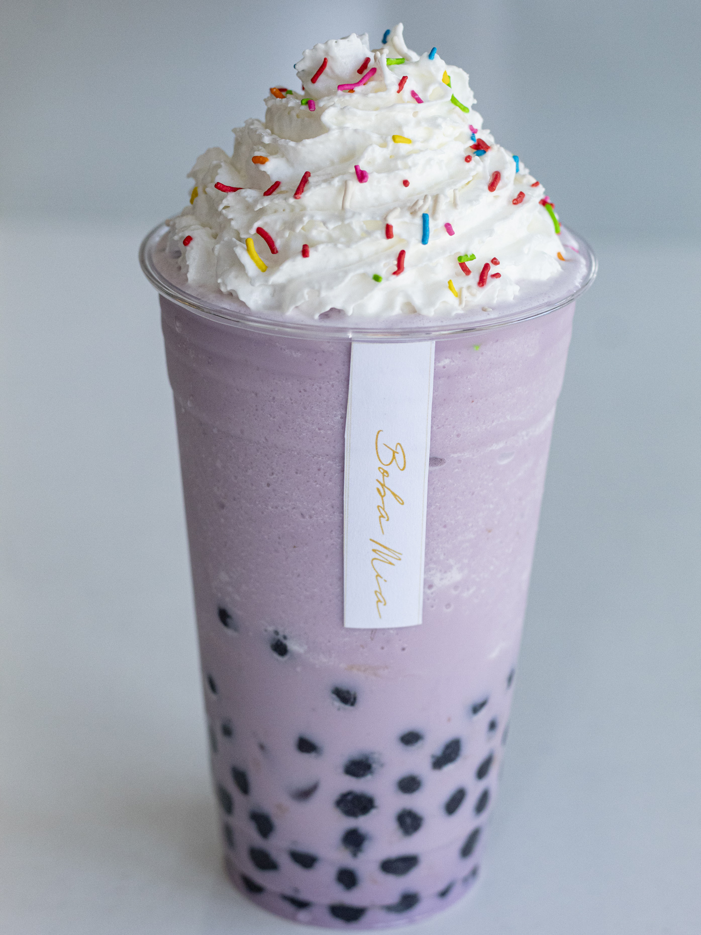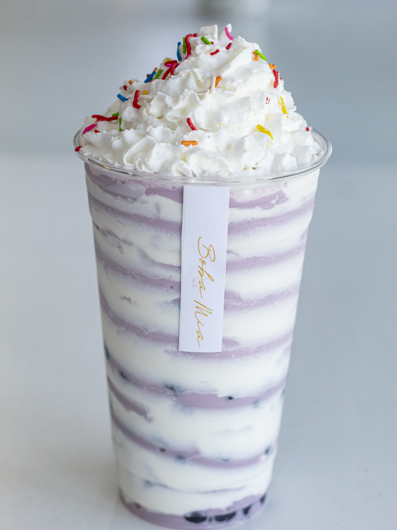 Frappe taro con cheese foam en el vaso y boba incluida