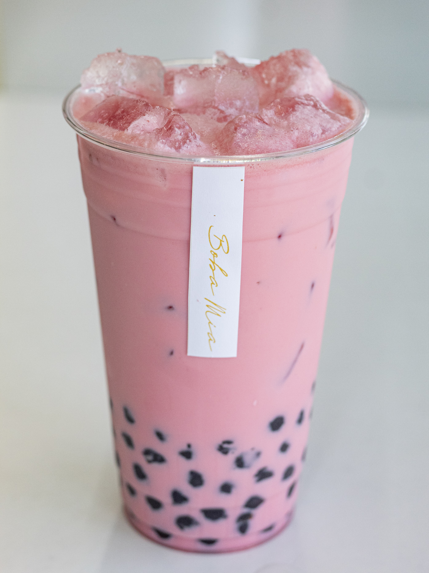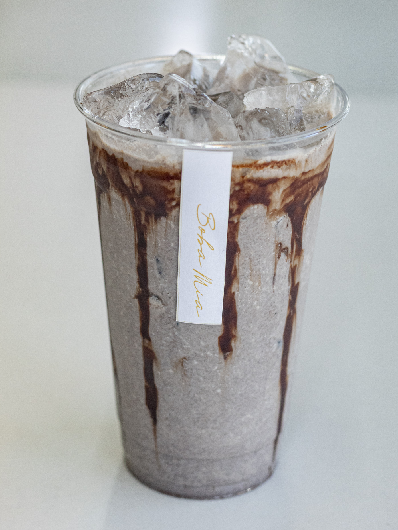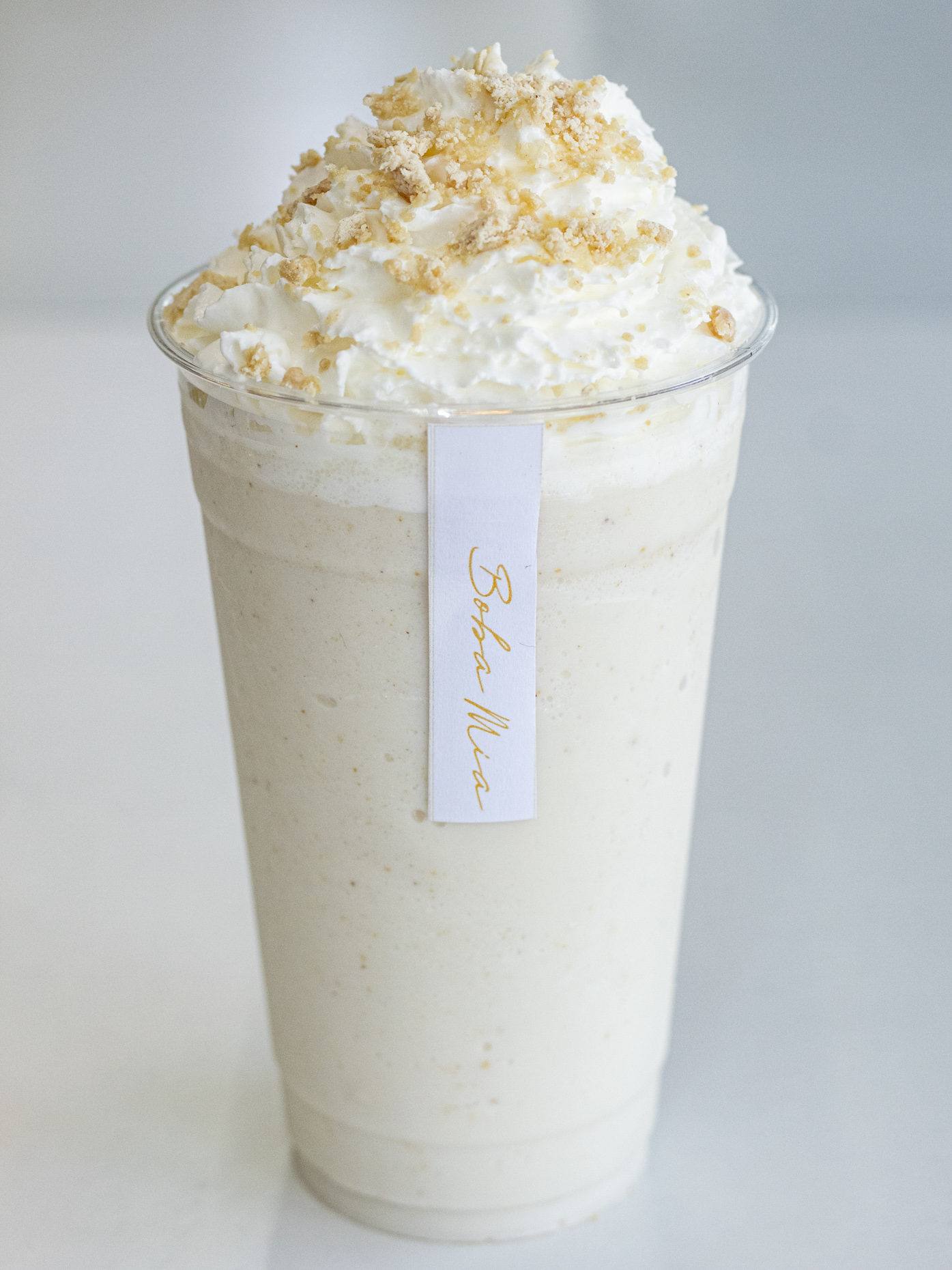 Frappe taro con cheese foam en el vaso y boba incluida
