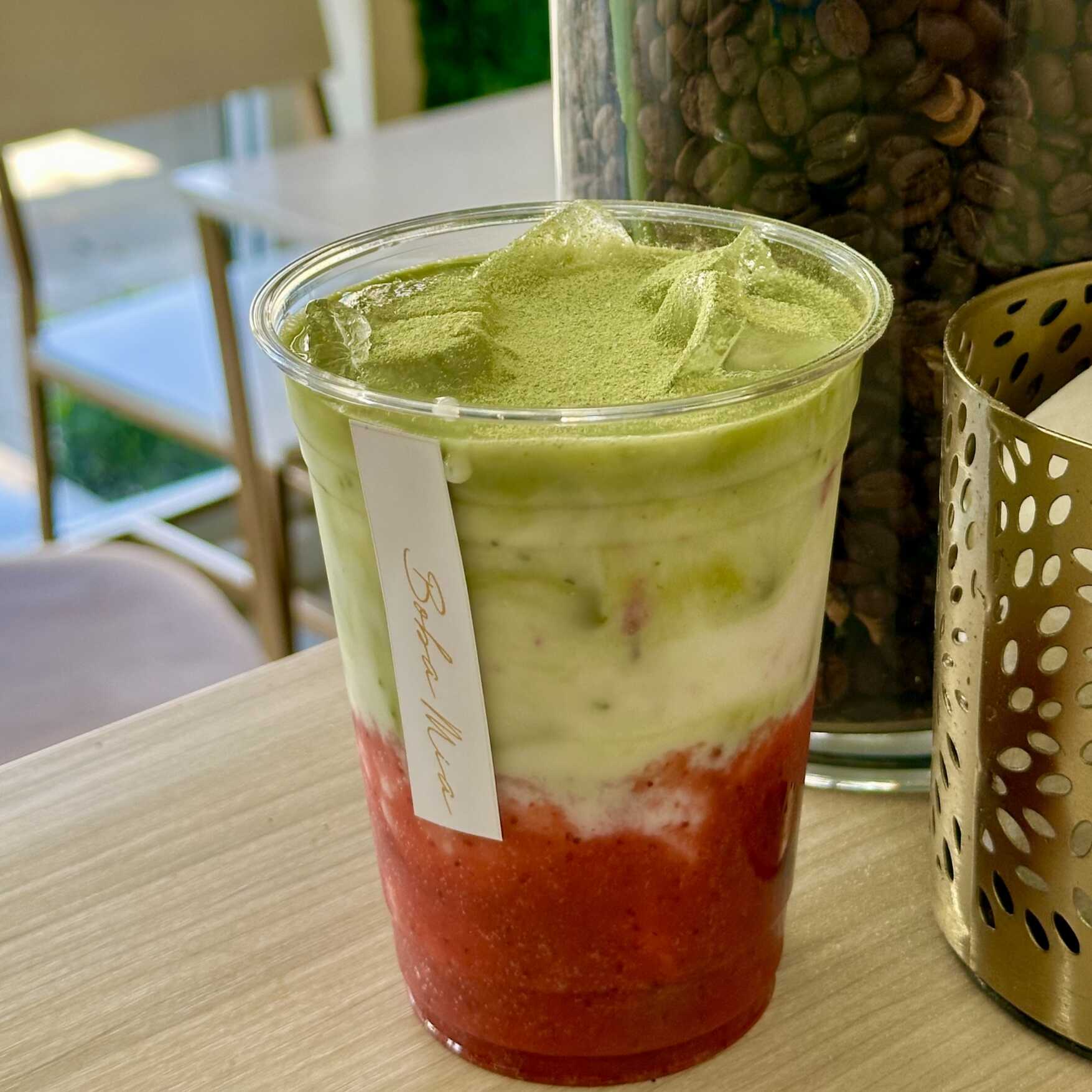 Matcha Oreo , frappe matcha y oreo con cheese foam en el vaso y en el fondo boba y oreo trozado , encima crema batida y mas oreo