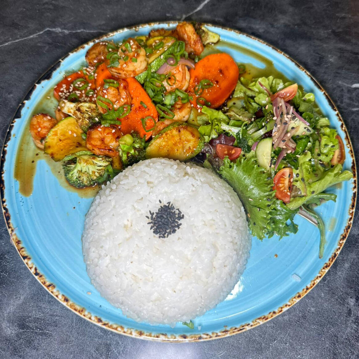 Camarón, res, pollo, acompañado de arroz blanco, vegetales mixtos bañados en una tradicional salsa teriyaki, ensalada verde con vinagreta de la casa