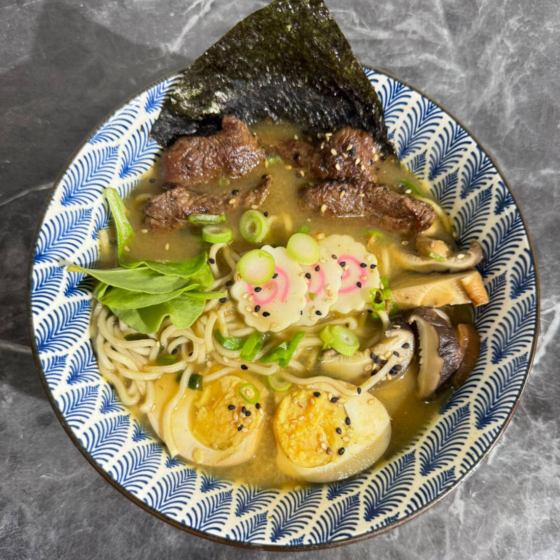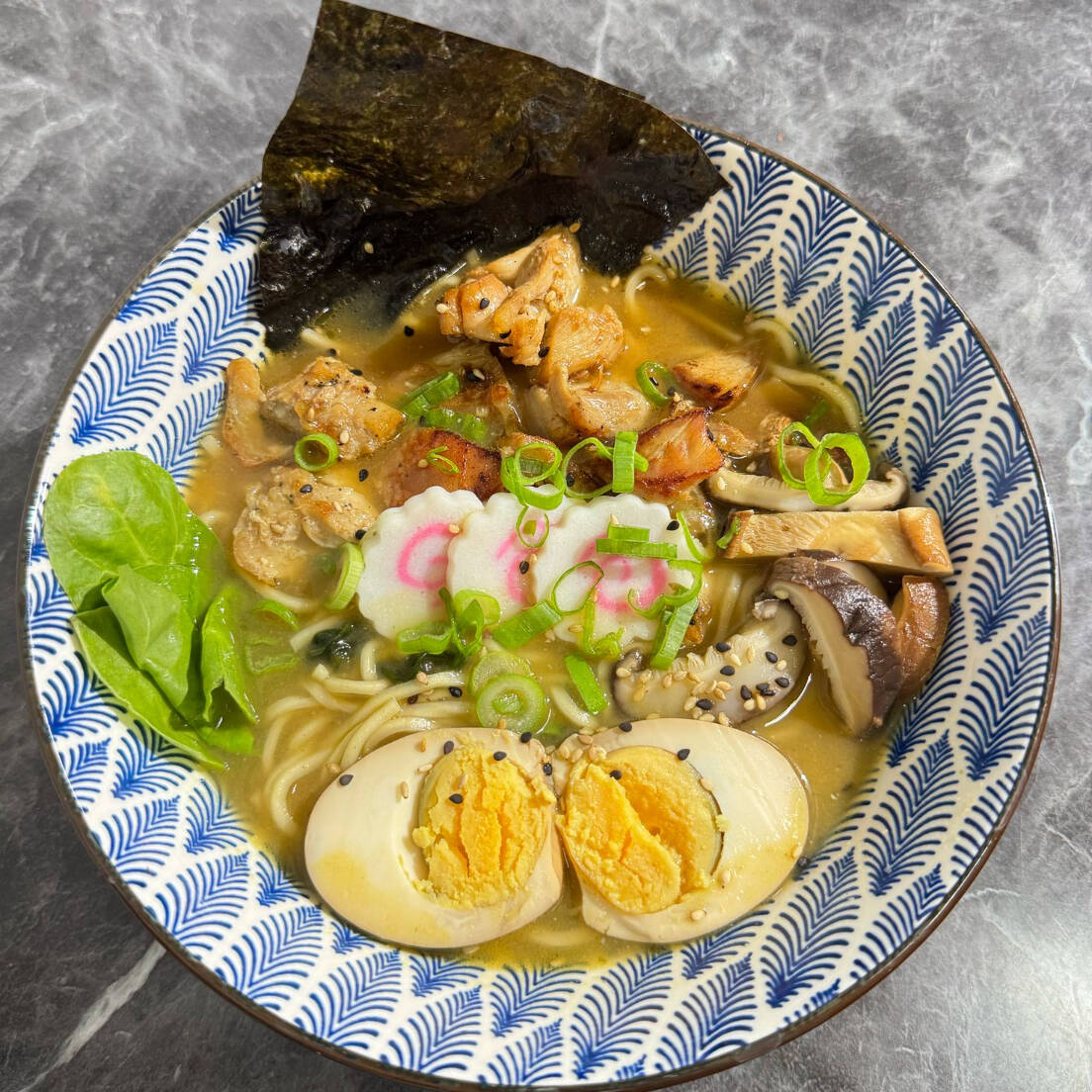 Deliciosa sopa ramen natural o spisy, shitakee, huevo, naruto, cebollin