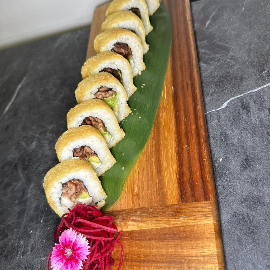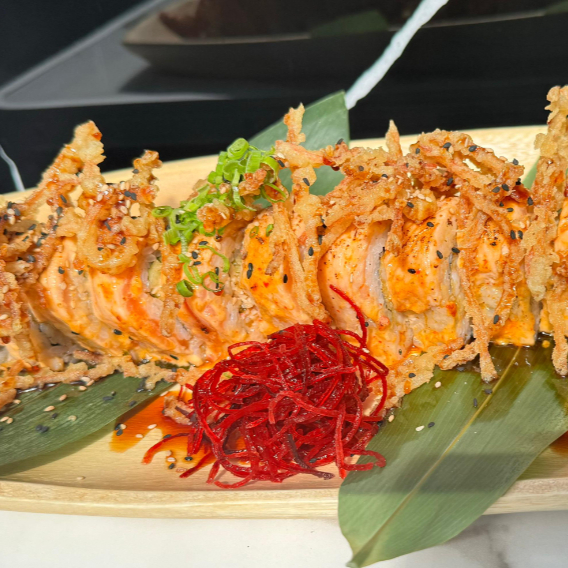 RELLENO DE SALMON AGUACATE Y QUESO CREMA ES CAPEADO BAÑADO EN SALSA SPICY Y CHILE JALAPEÑO